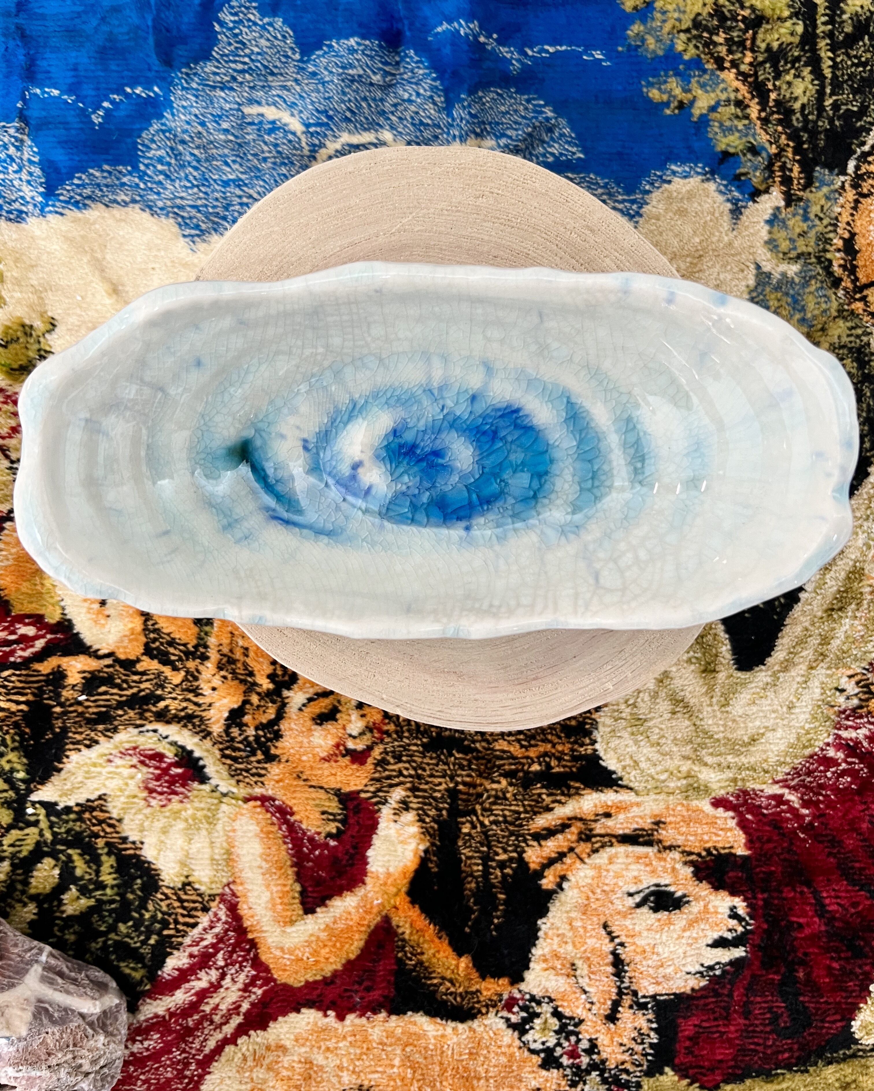真ん中に掛けて濃い青がグラデーションを描く模様がユニーク横長な器。