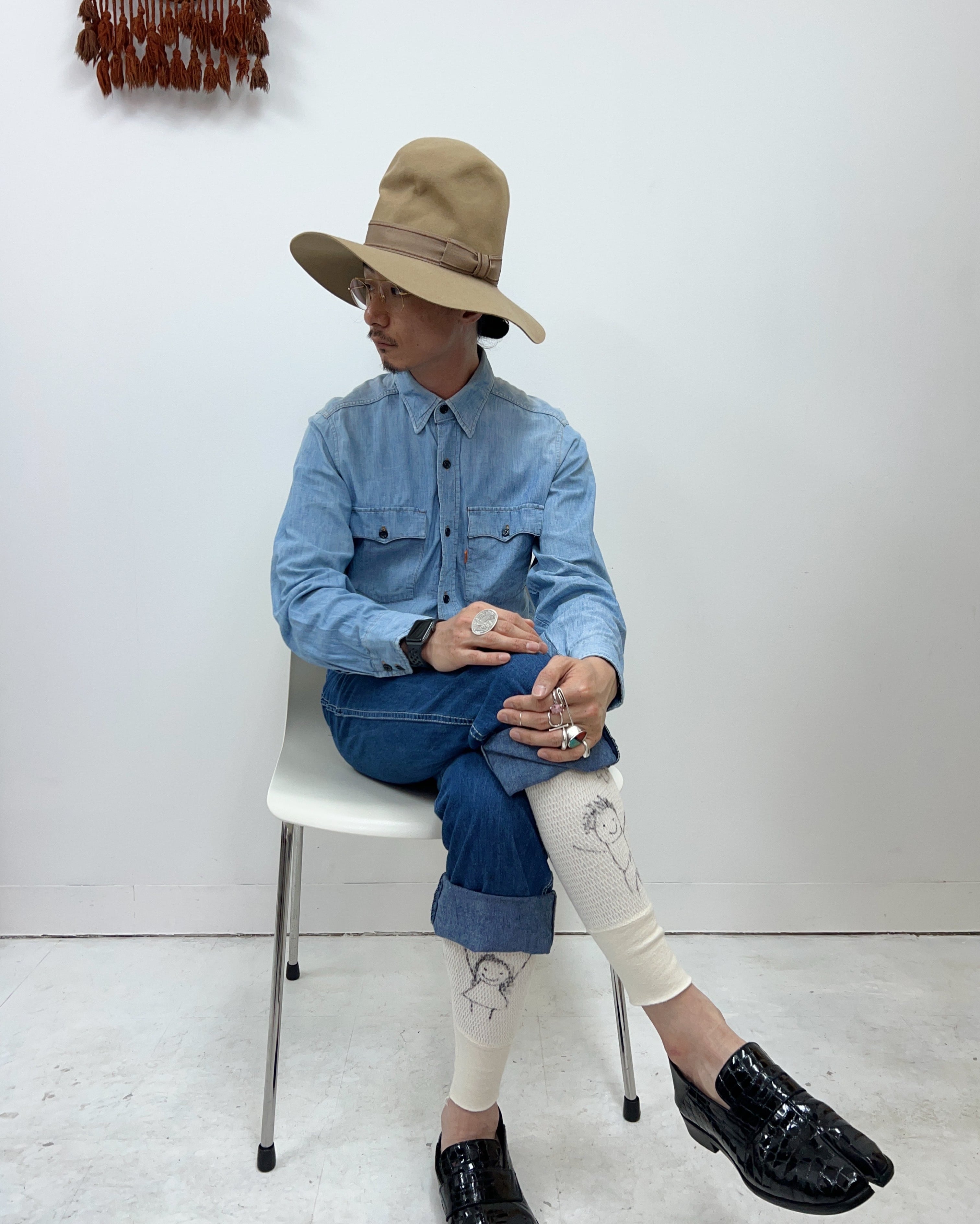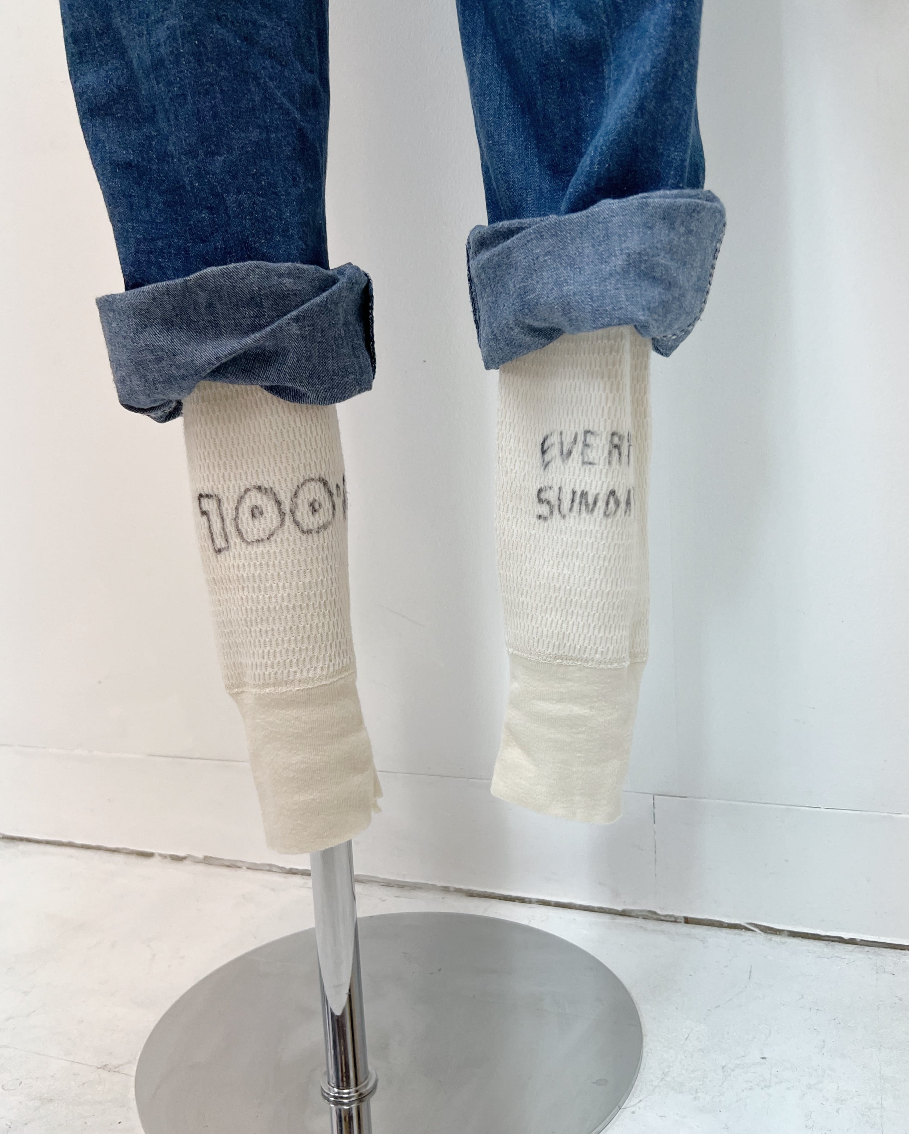 敢えて膝下のみにペイントを施しているのでワイドシルエットなパンツを膝下くらいまでロールアップ、またはショーツと合わせて絵をチラッと見せて穿くのも面白いです。