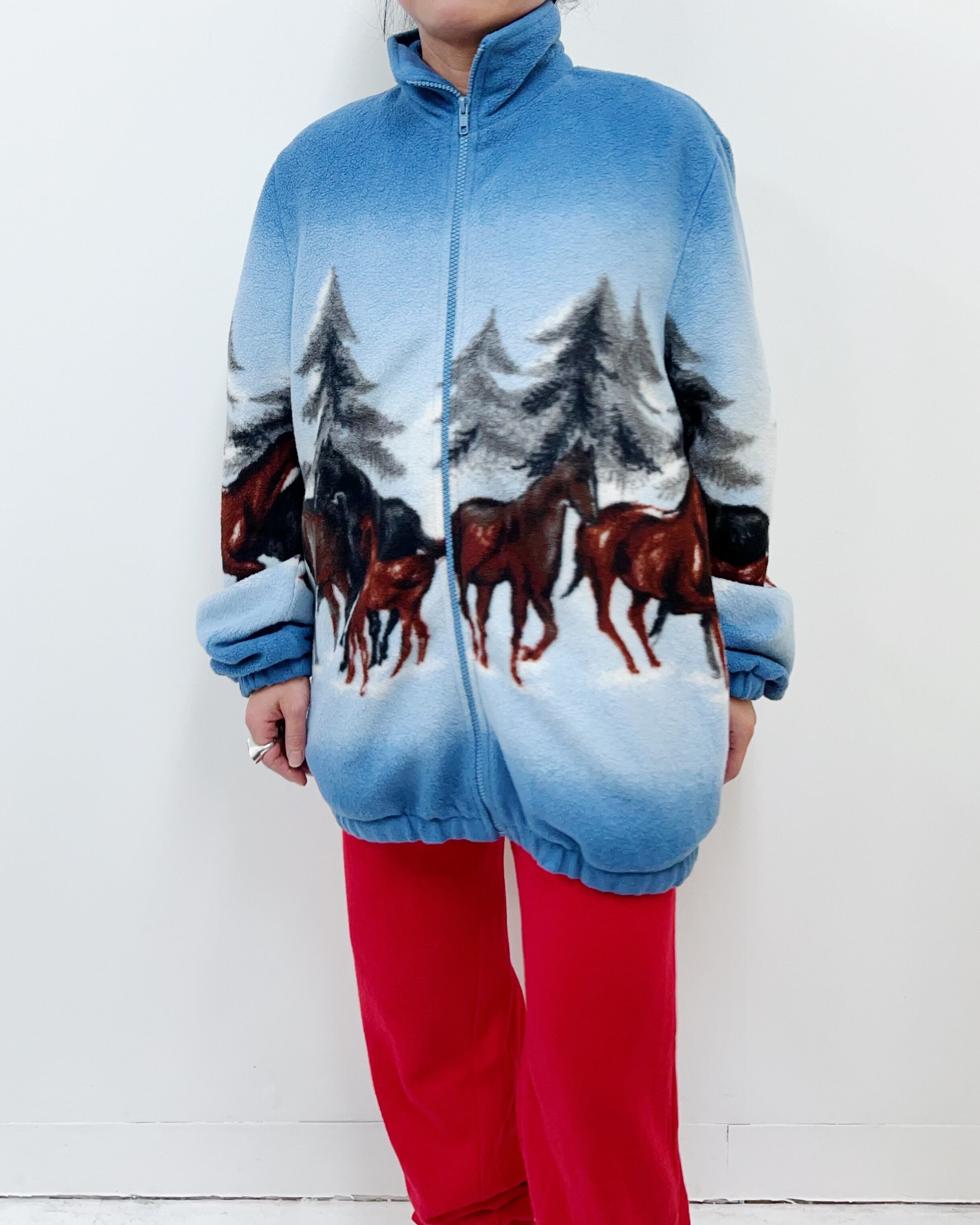 雪山で黄昏れる馬がプリントされたユニークなフリースジャケット(おそらく20頭くらい)
