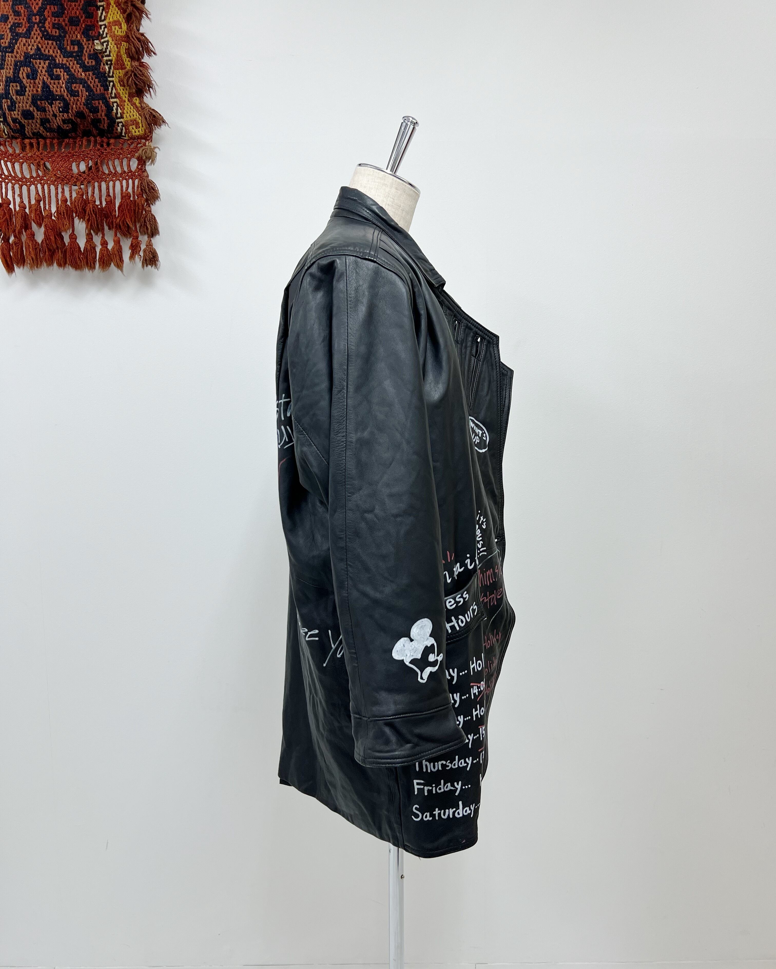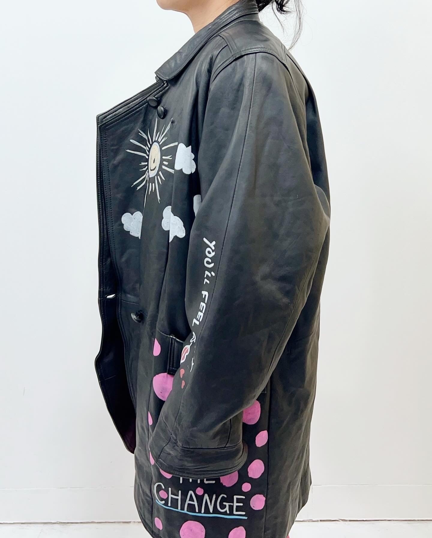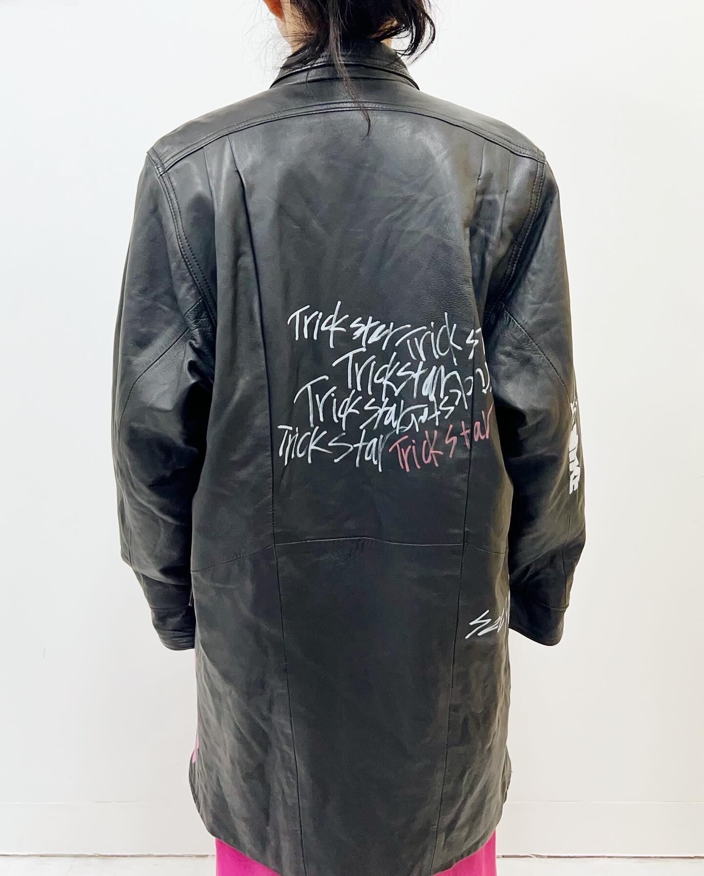 そのレザージャケットにtamago storeでカスタムペイントを施したスペシャルな一枚。全体的にポップな仕上がりですが、白を基調としているので、可愛いけれど可愛すぎない。メンズも着たくなるデザインへと仕上げています。