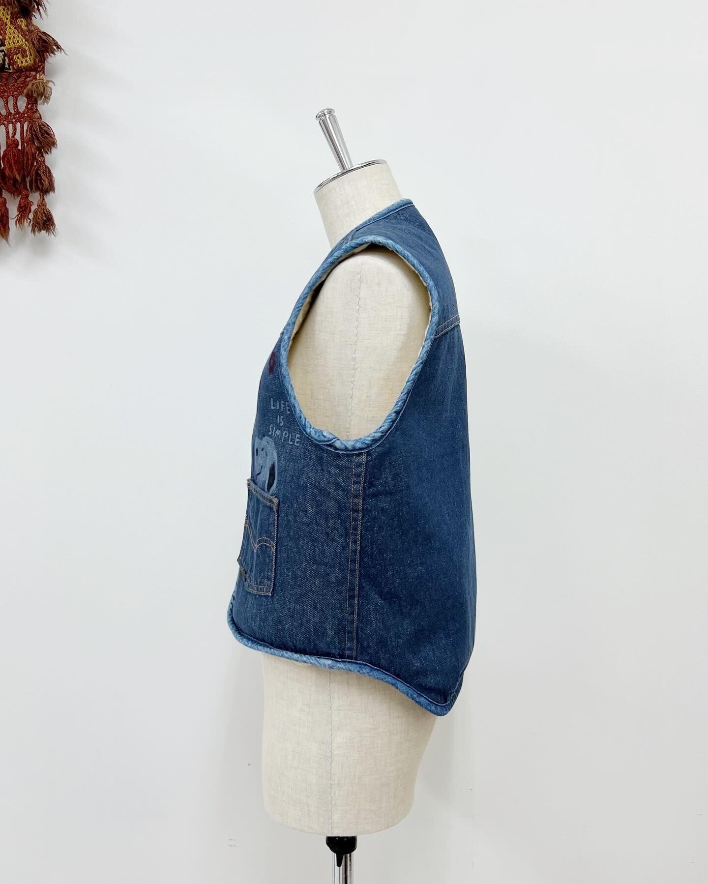 濃いめのインディゴブルーが良いアクセスとなりインナーとしても使いやすい程よいサイズ感が魅力的なボアベストにtamago storeでペイントし"70年代"と言う時代背景を合わせたハッピーでピースフルな一枚へとカスタム