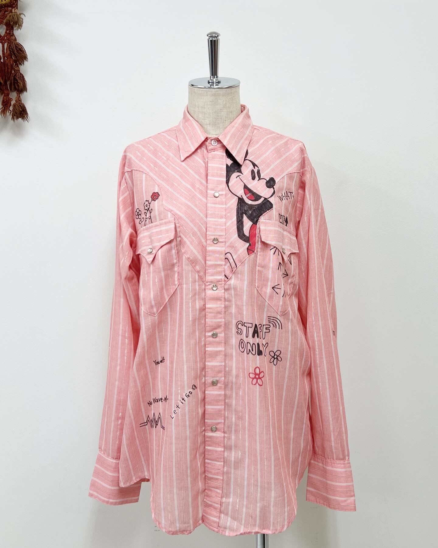 vintageのウエスタンなどで見られるヨーク部分にシンメトリーに施された刺繍とは異なる、アシンメトリーでキッチュな一枚へと仕上がっています。
