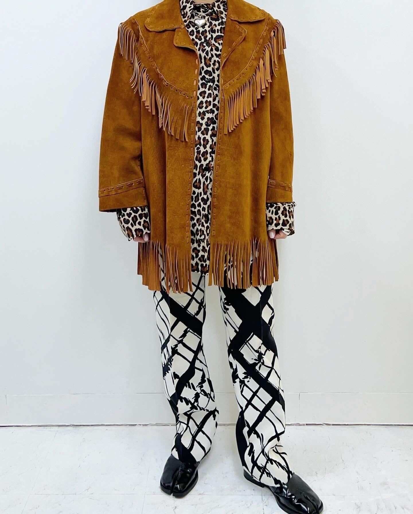 身頃の裾部分のフリンジまでも一枚で仕立て上げられたユニークなデザインに目を奪われます。