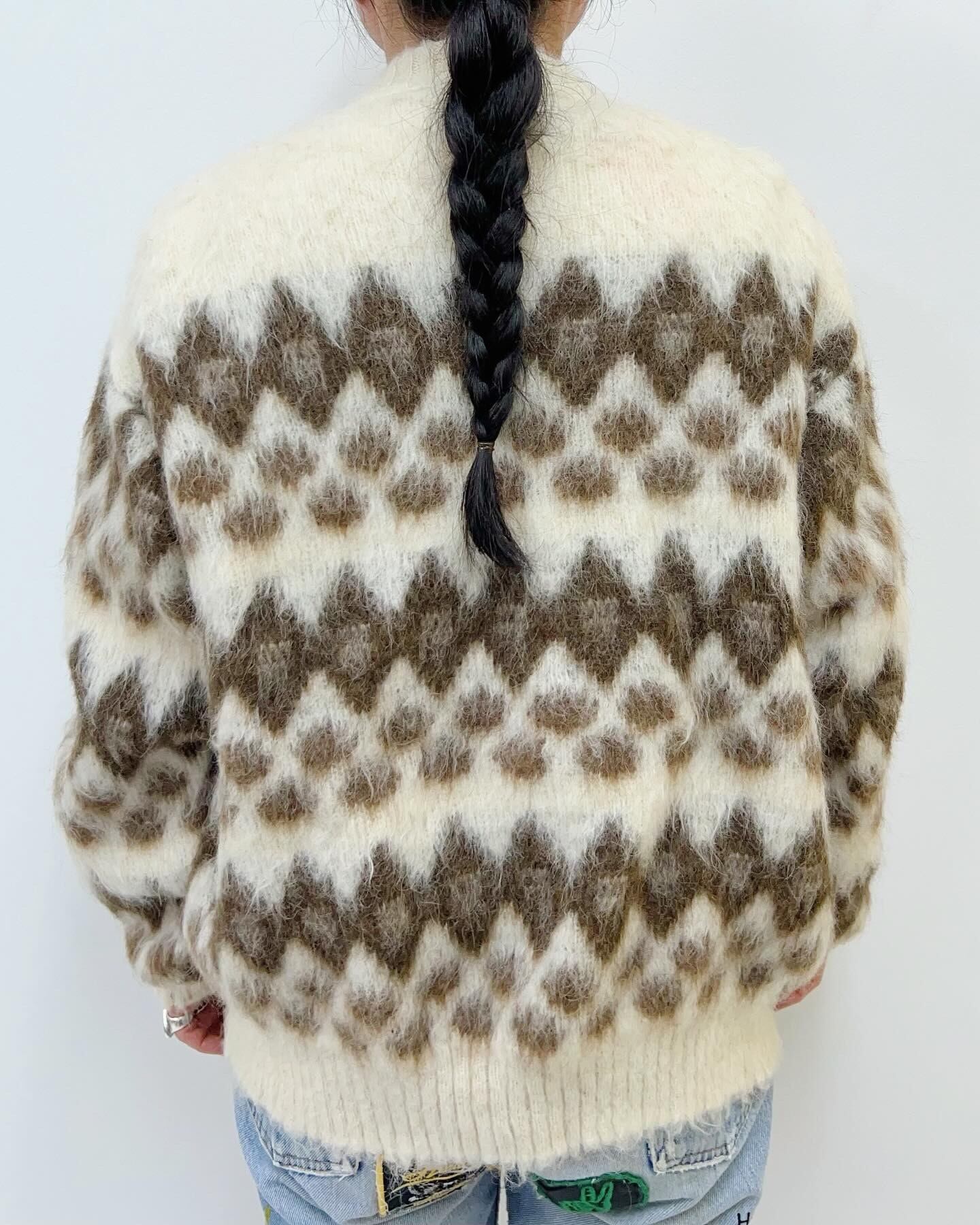 毛足の長いアイスランドウールを用いて作られたダイヤ柄のカーディガン。