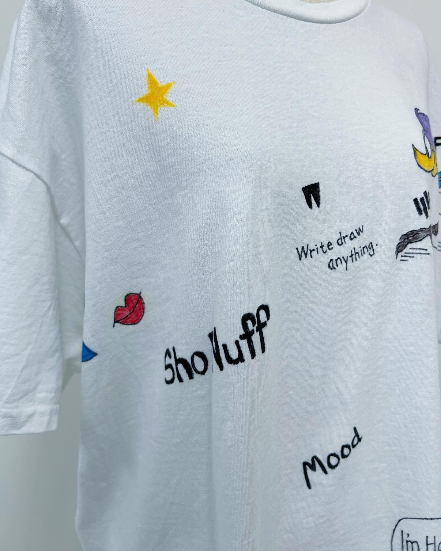 deadstock(未使用品)のT-shirtsを水通しし、tamago storeにてドローイングを行った