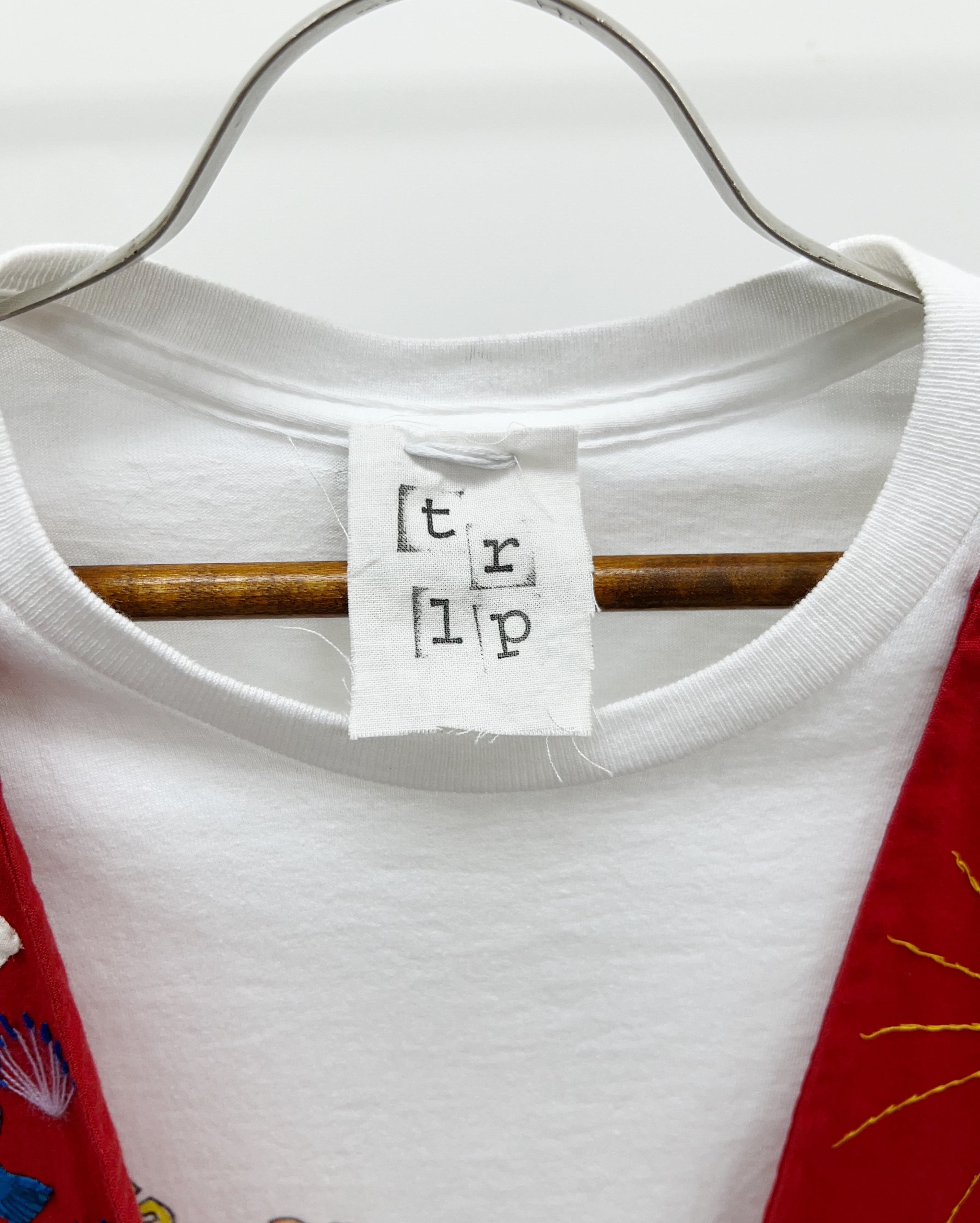deadstockのTシャツにtamago storeにてペイント、ベストの前身頃だけをドッキングさせてtrompe-l'oeil(騙し絵)ベストをレイヤードしているかのように見えるデザインTシャツへとアップデート