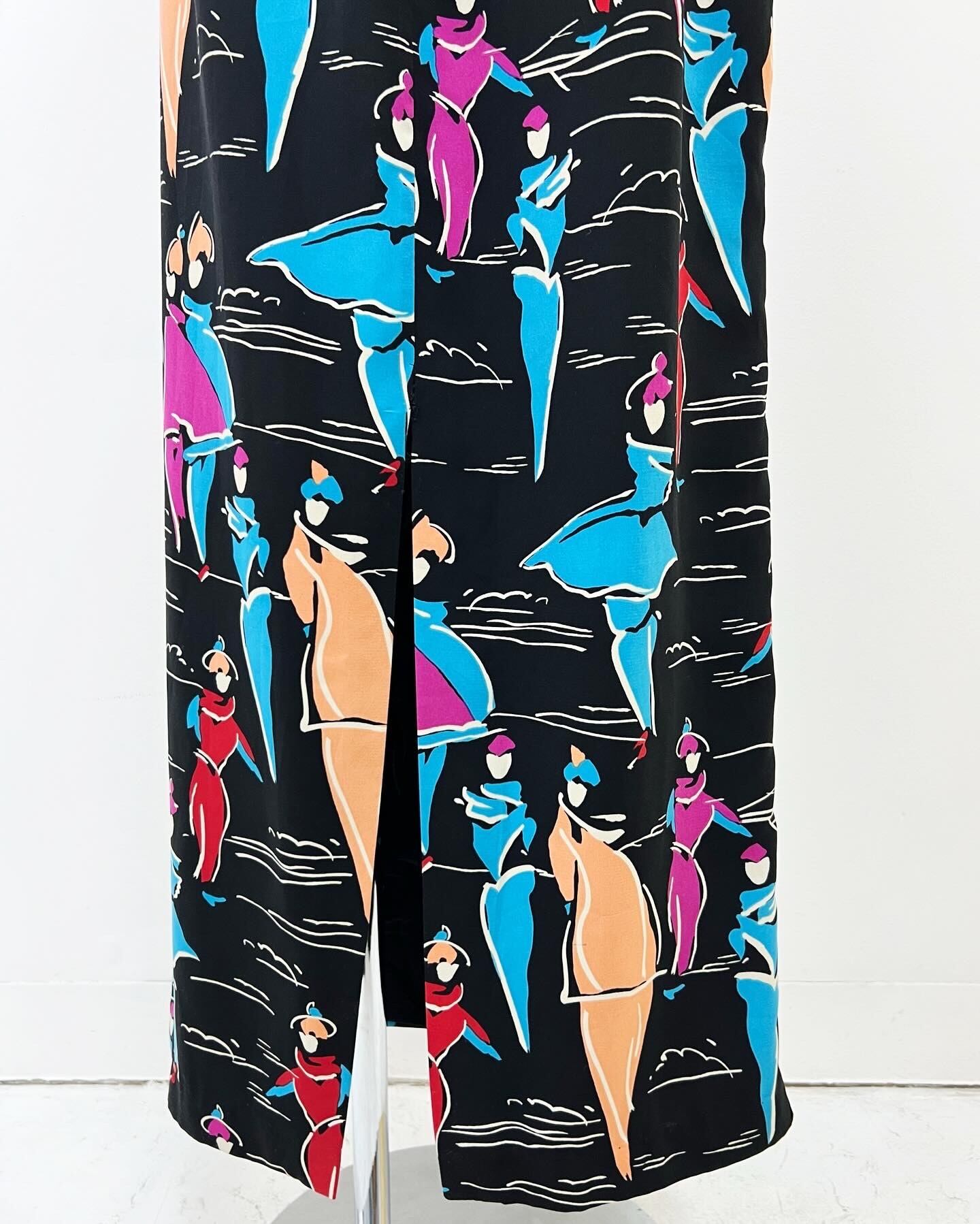モダンなプリントが70年代らしいロングスカート。表地はポリエステルで軽やかさもあり、
