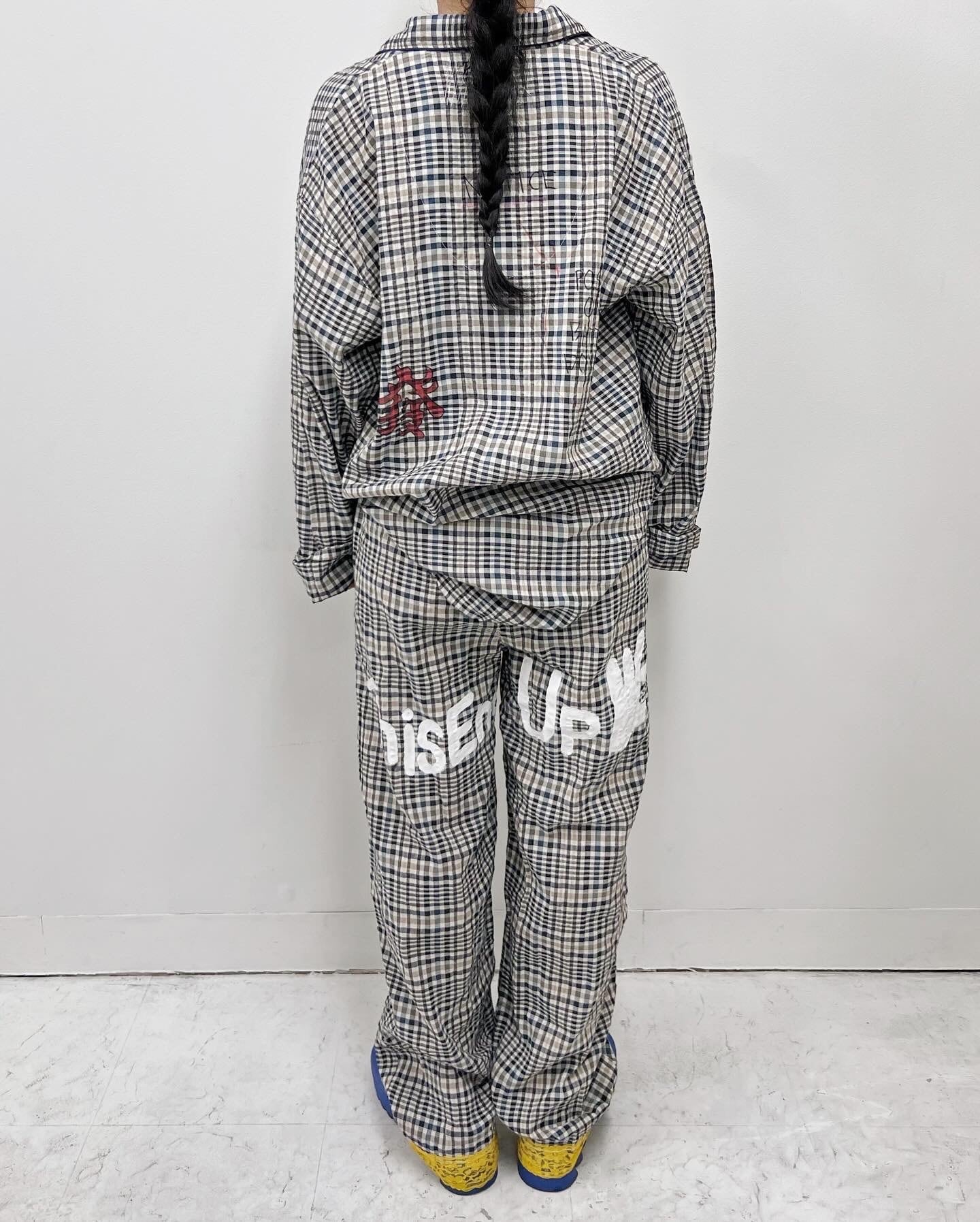 ダークトーンのチェックながらシアサッカー地で涼しげな印象が特徴のパジャマにtamago storeでドローイングカスタム