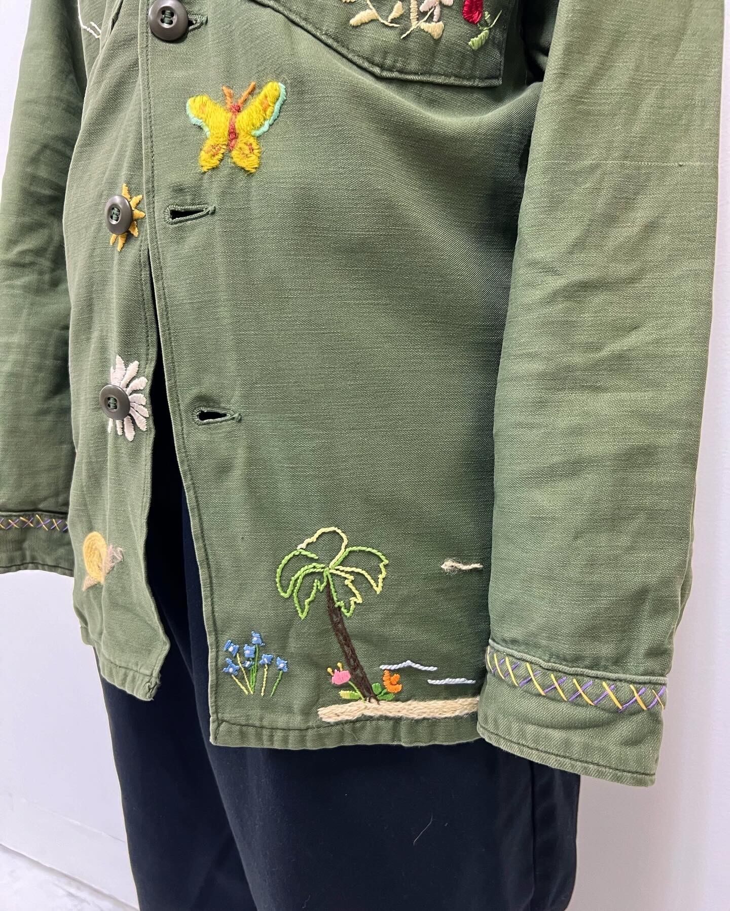 US ARMYの定番アイテムであるコットンツイルのフィールドジャケットに70年代らしいハンドワークによる豪華な刺繍がズラリ。