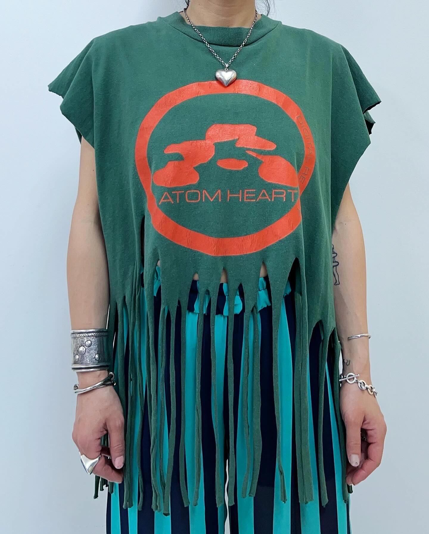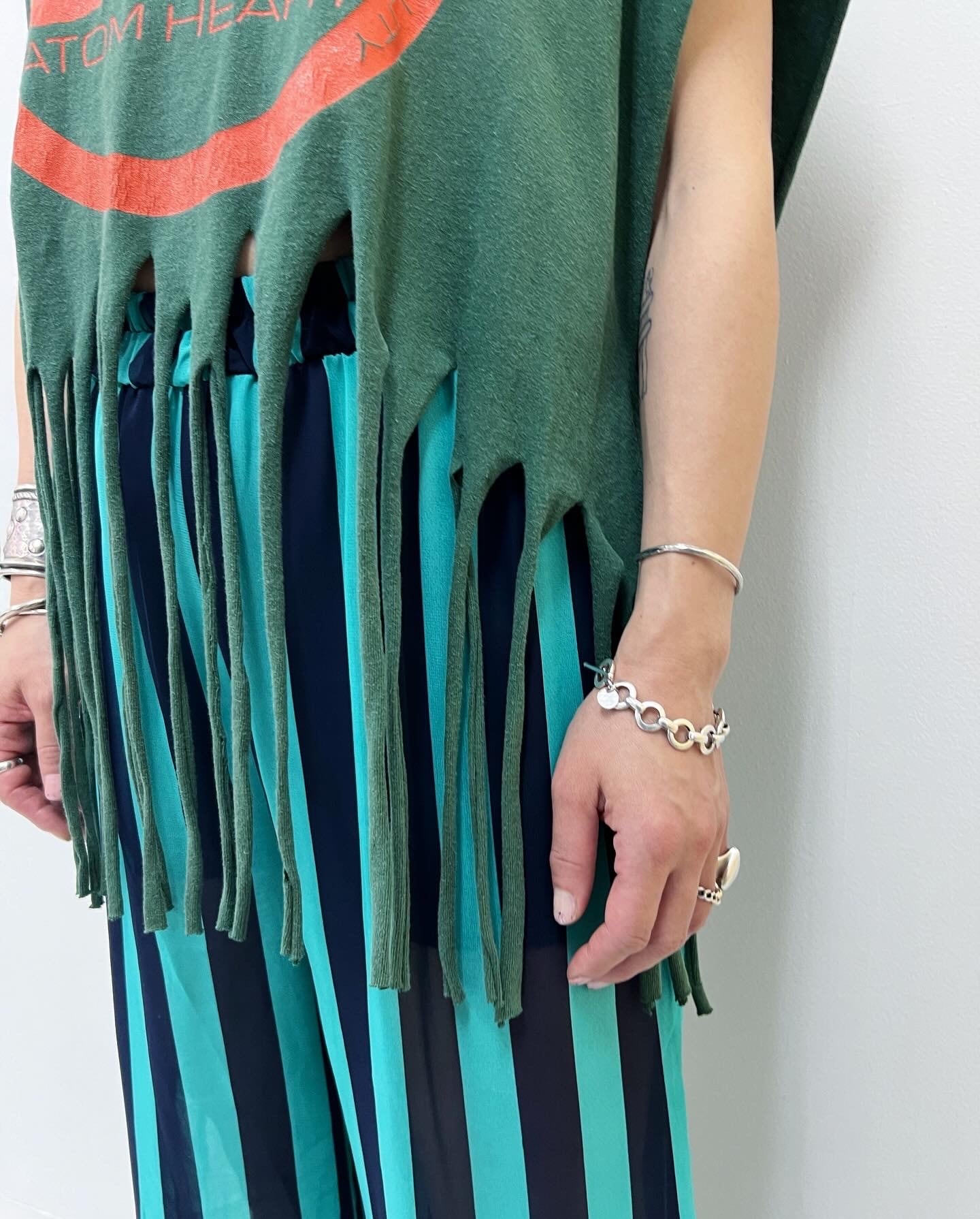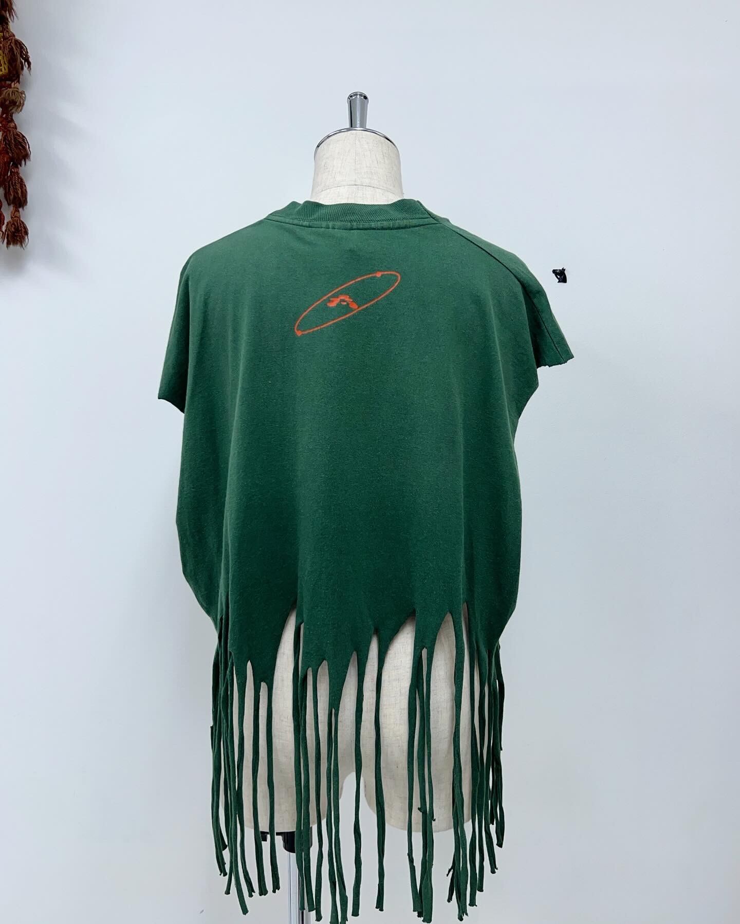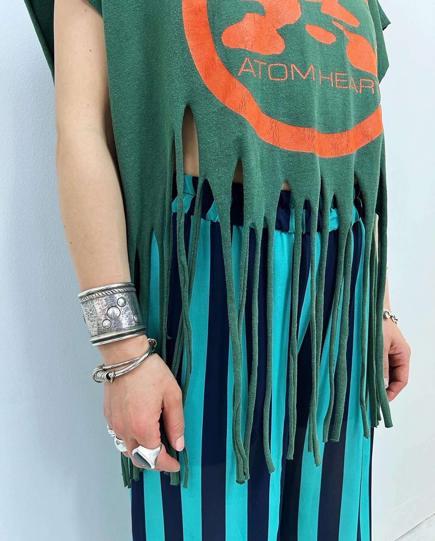 XLとゆったりした身幅を活かして袖付け根から脇周りを広めにカットオフ。着丈はそのままにリブを切り落としてランダムなフリンジ調にカスタム