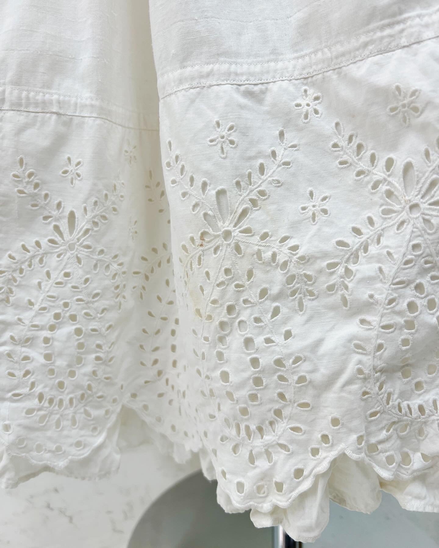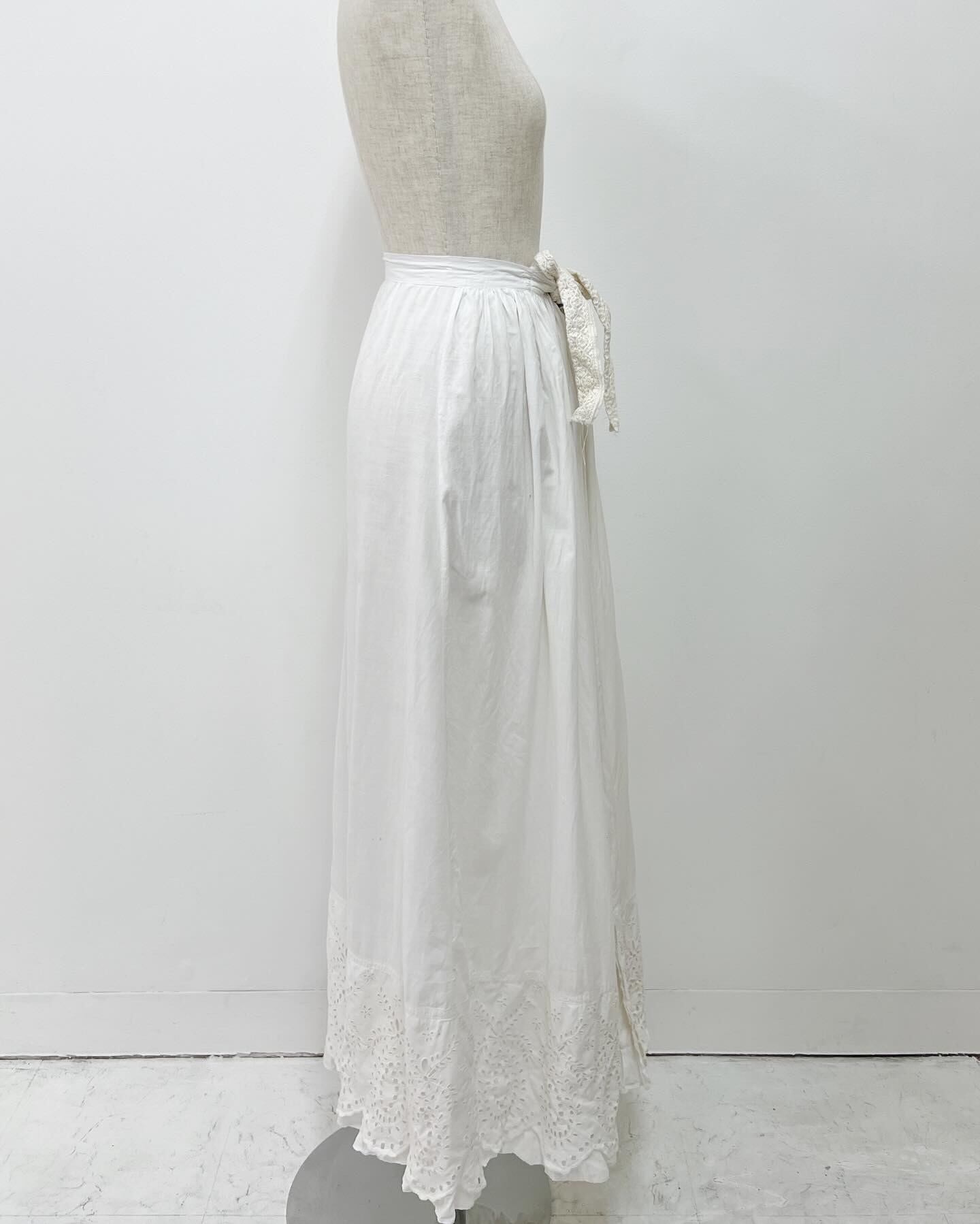 高貴な物として重宝されていたアンティークコットンのインナースカート。ウエストが大きく、着用しにくいアイテムだったので巻きスカート風にカスタム