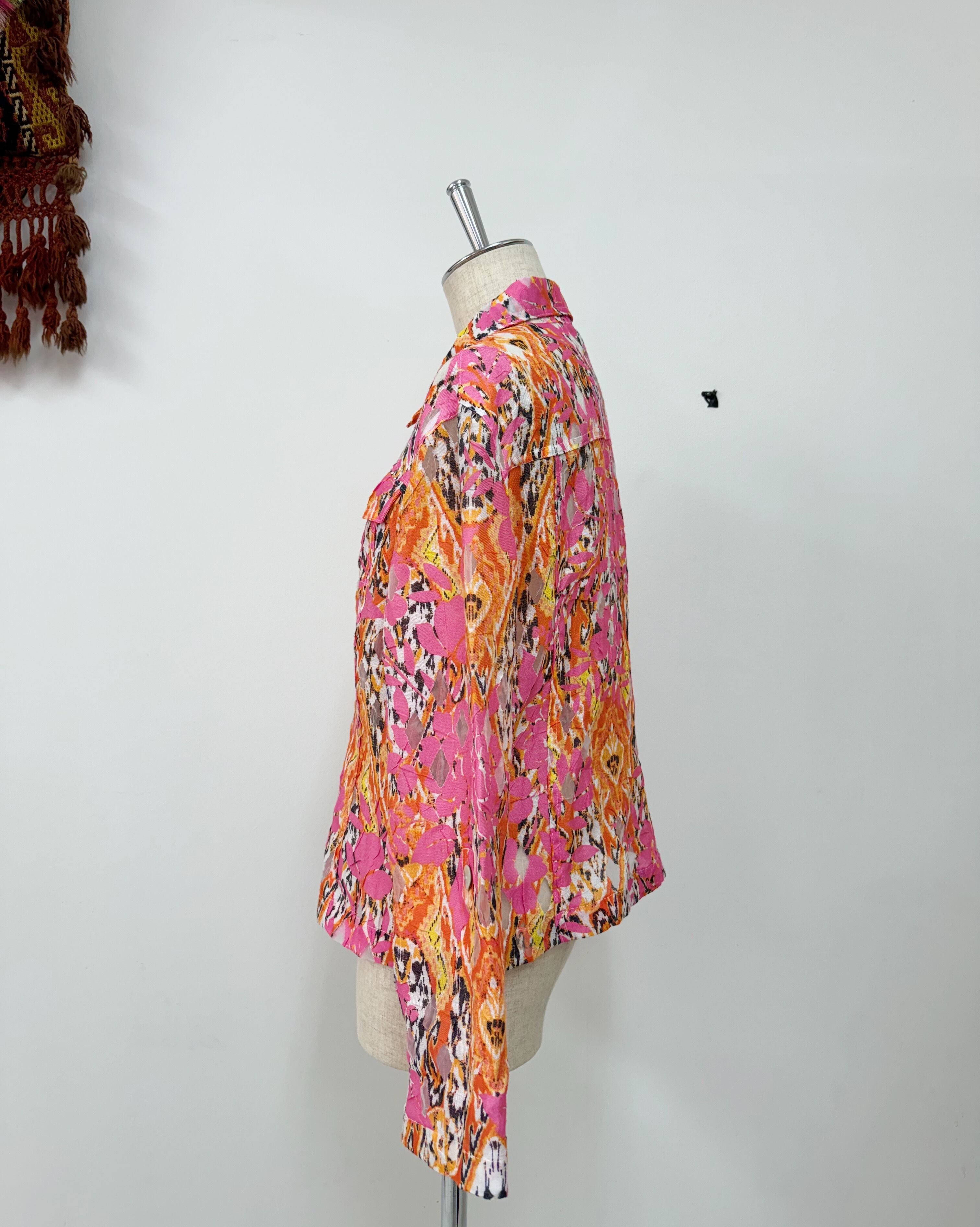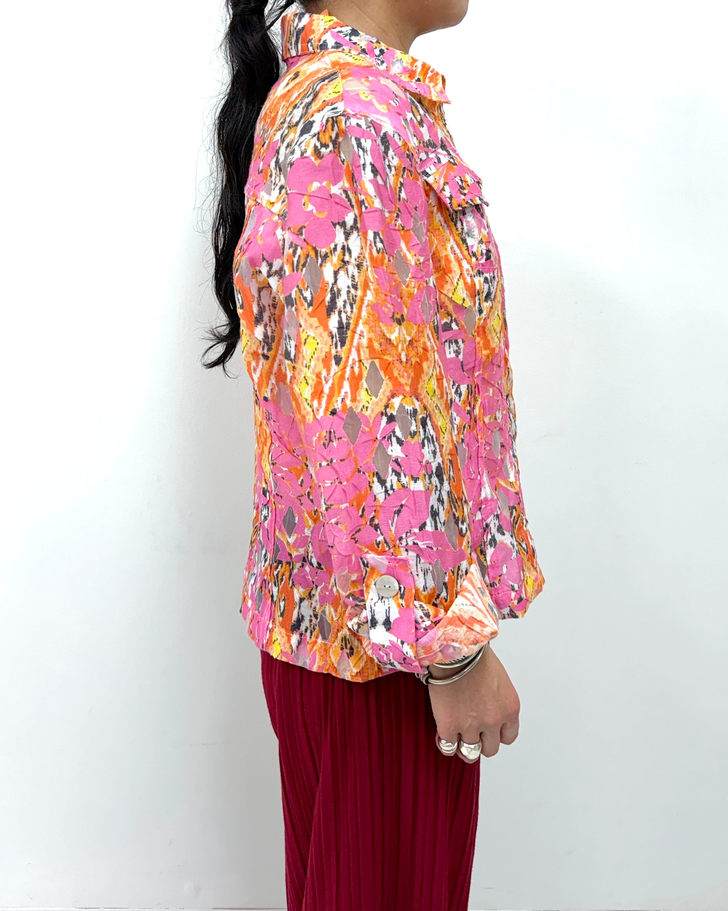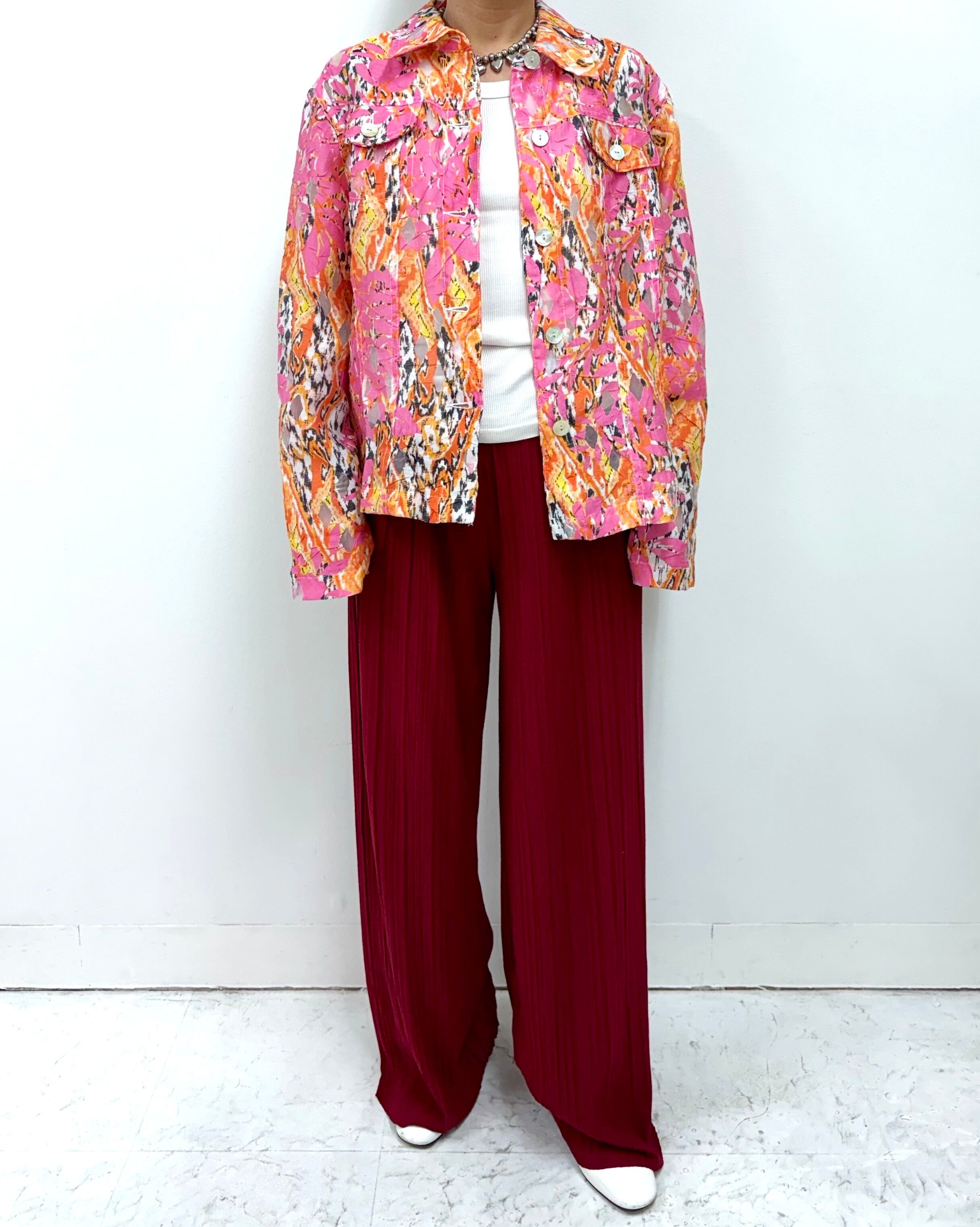 同系色の花が連なったかのようなグラフィックが気分を盛り上げてくれるシースルージャケット