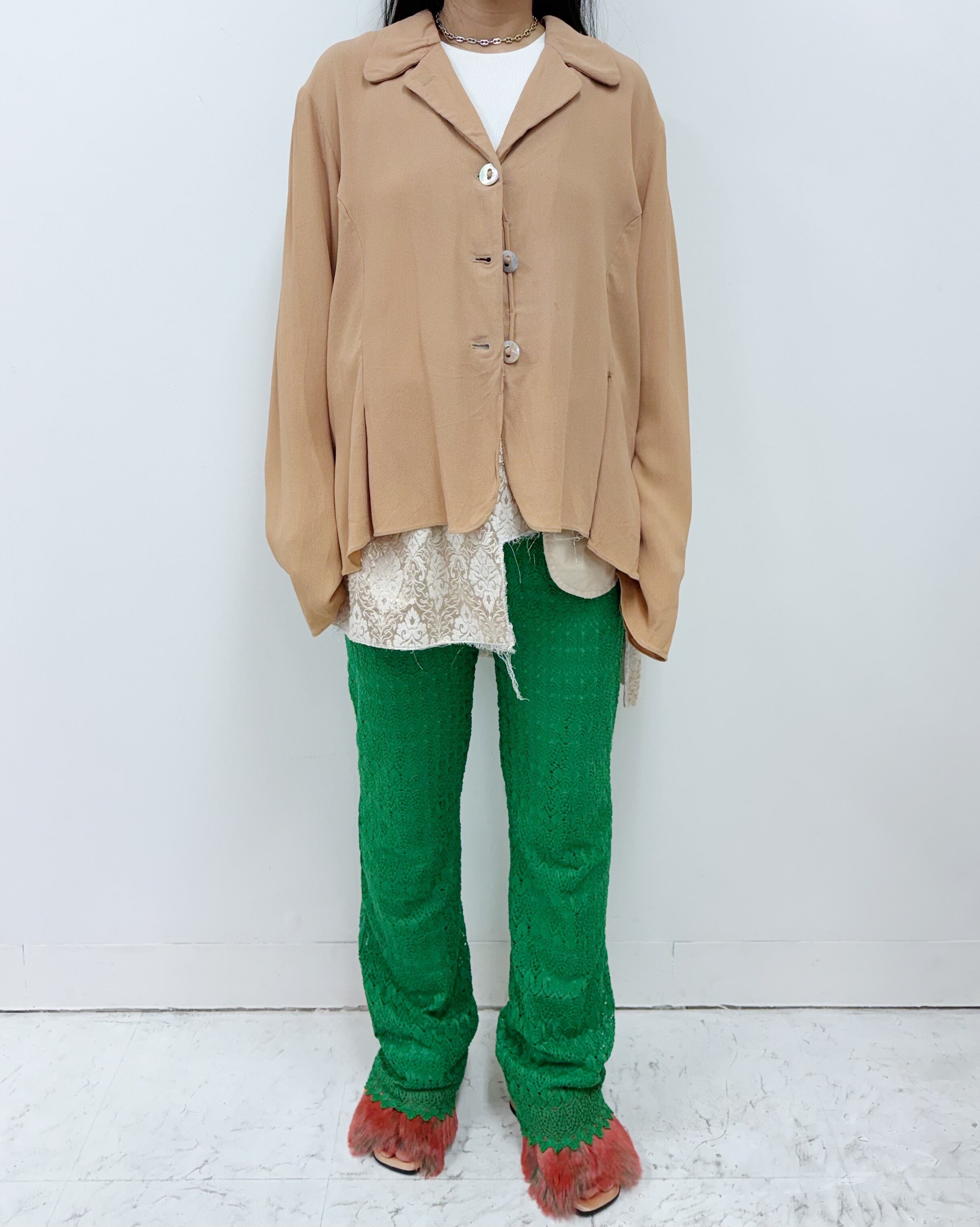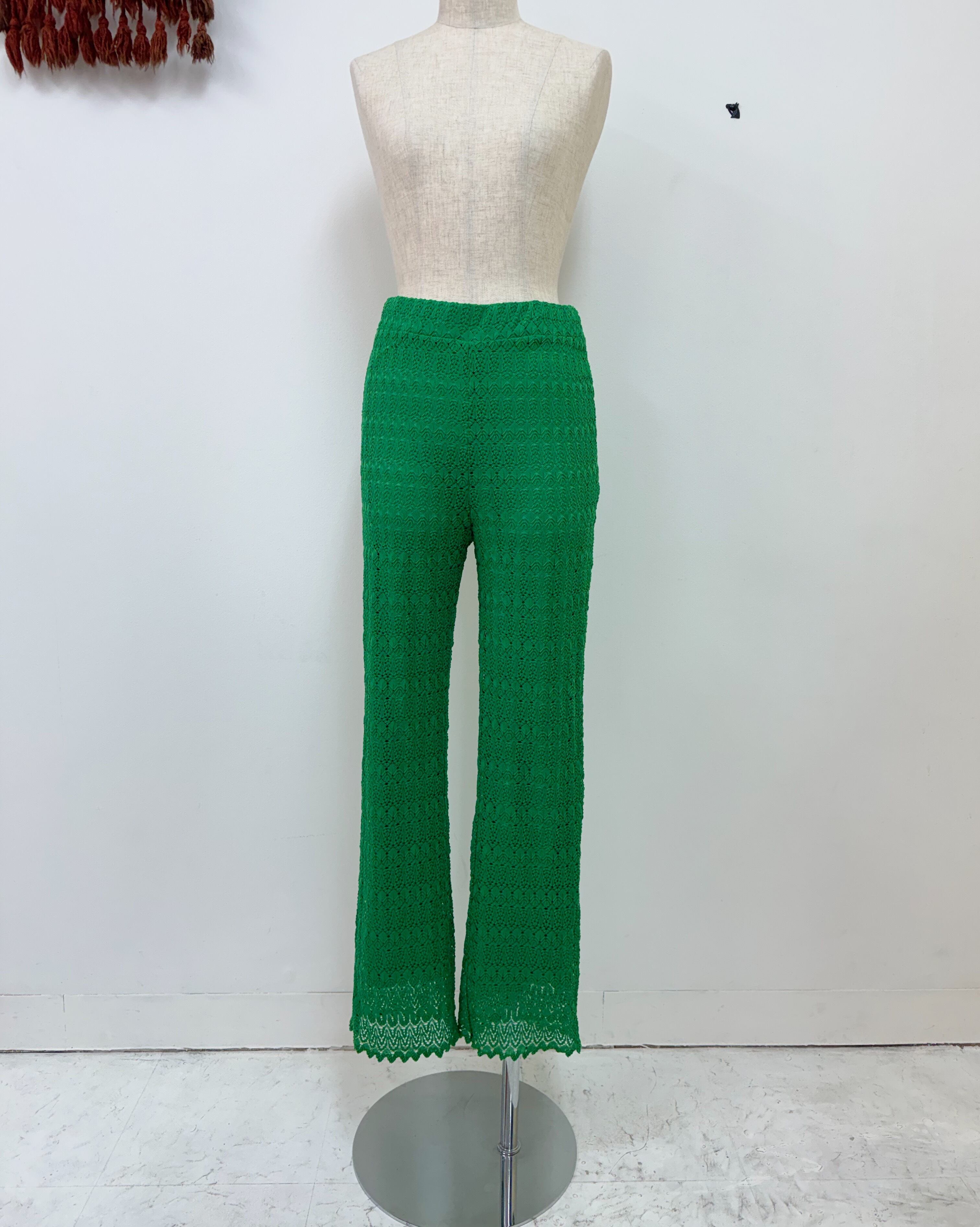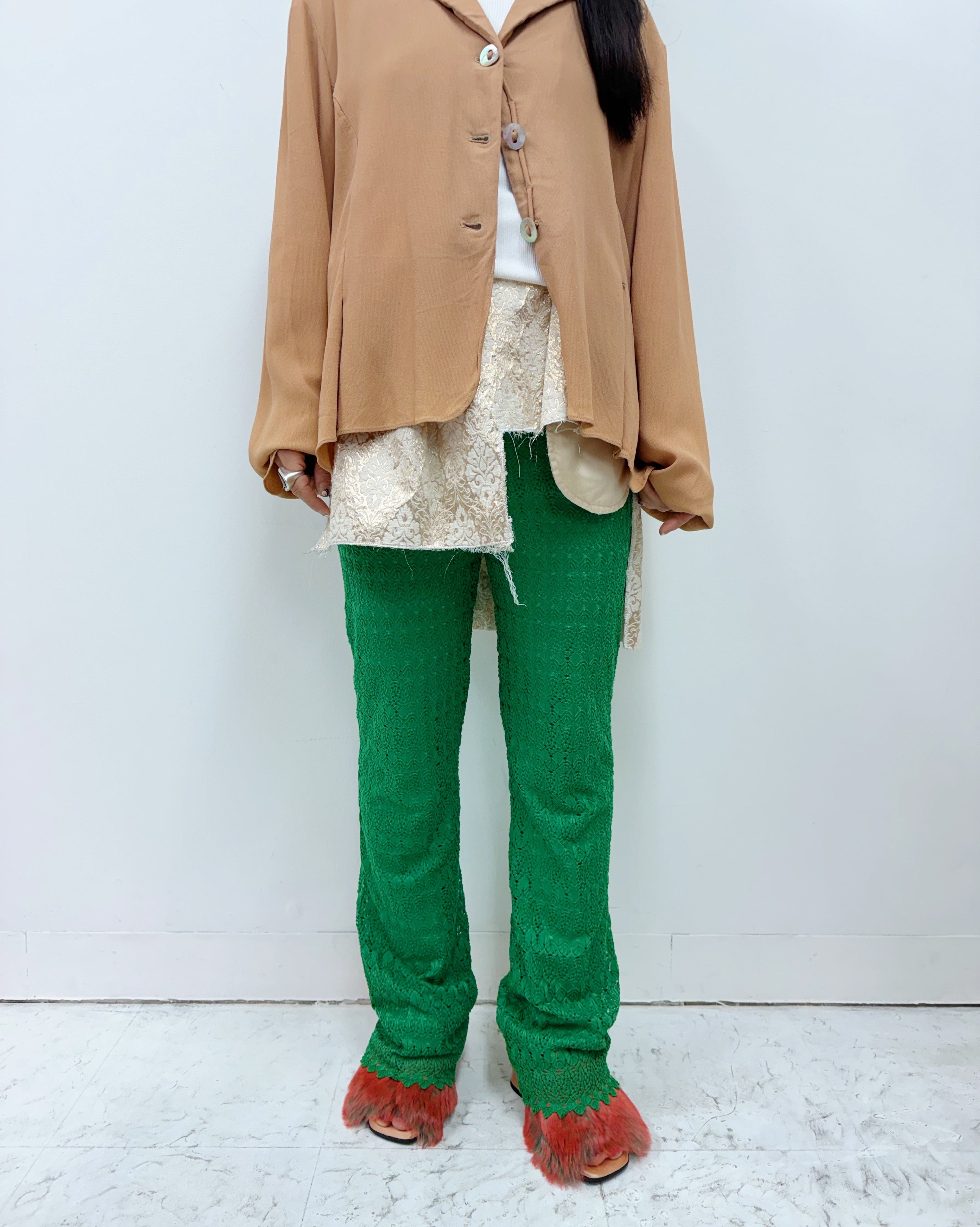 鮮やかなグリーンが目を惹くフレアシルエットのレースパンツ