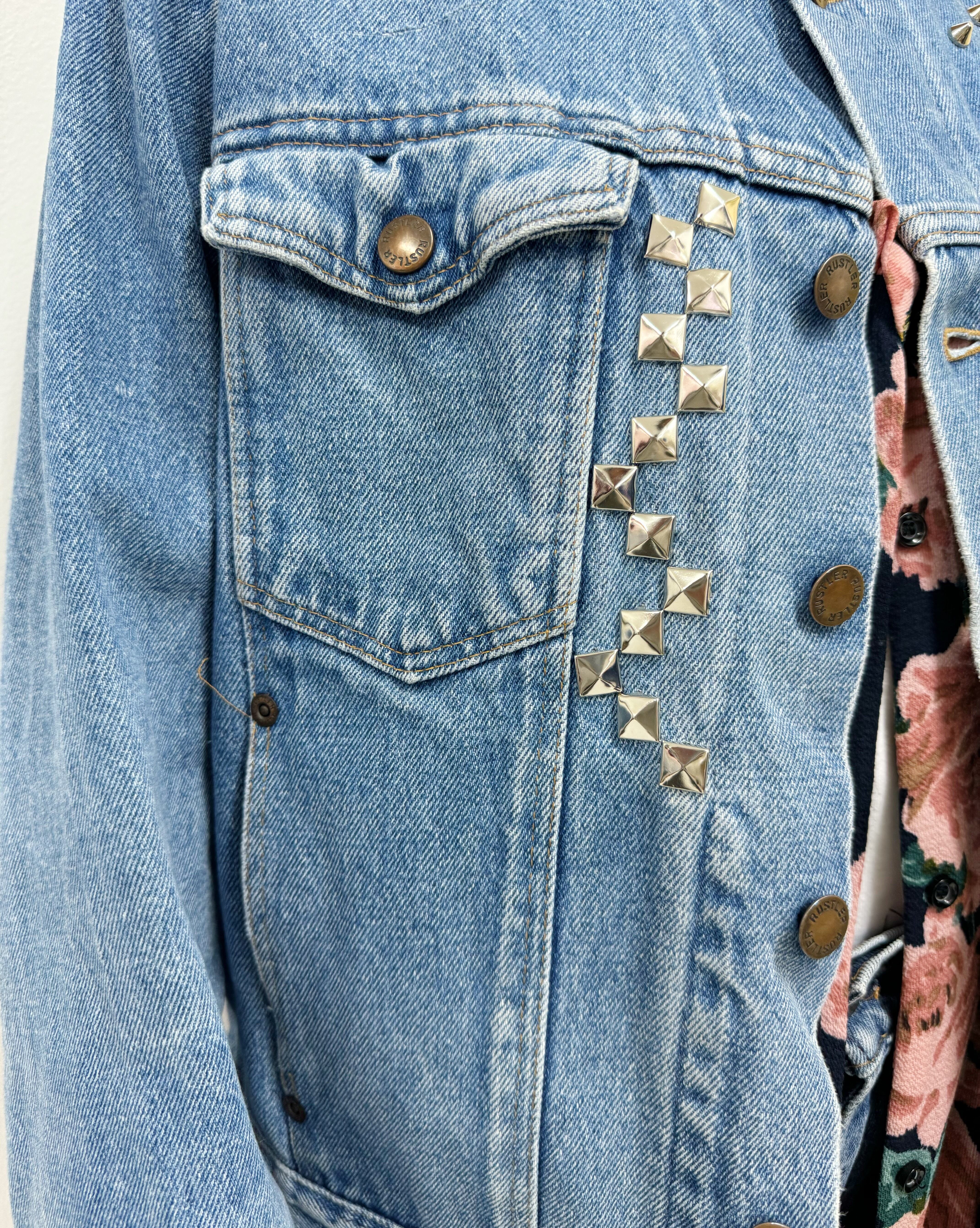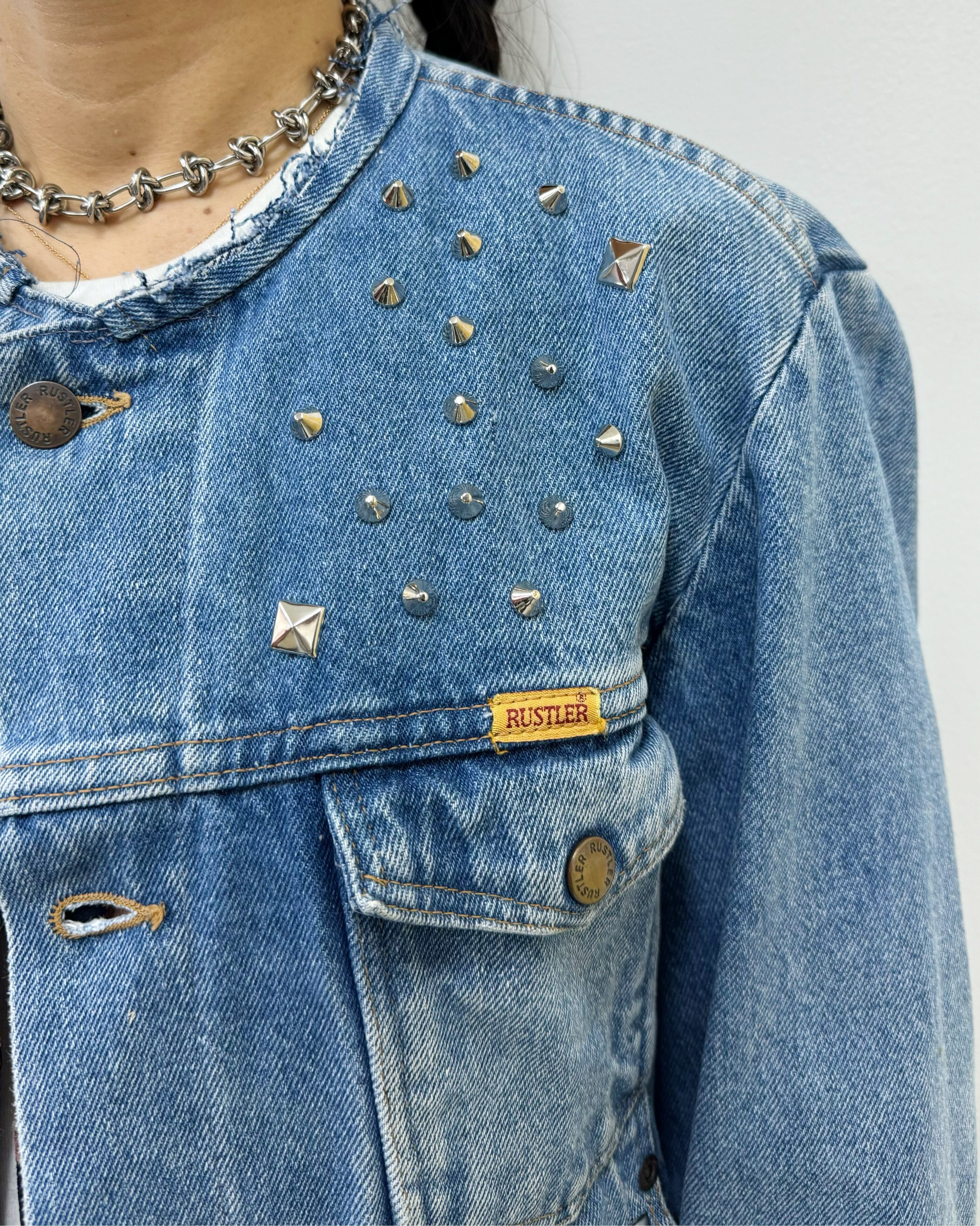程よい色落ち具合が使い勝手の良いデニムジャケットにtamago storeのカスタムの中でも人気を博すスタッズカスタマイズ(後身頃のダメージ加工は買い付け時からです)