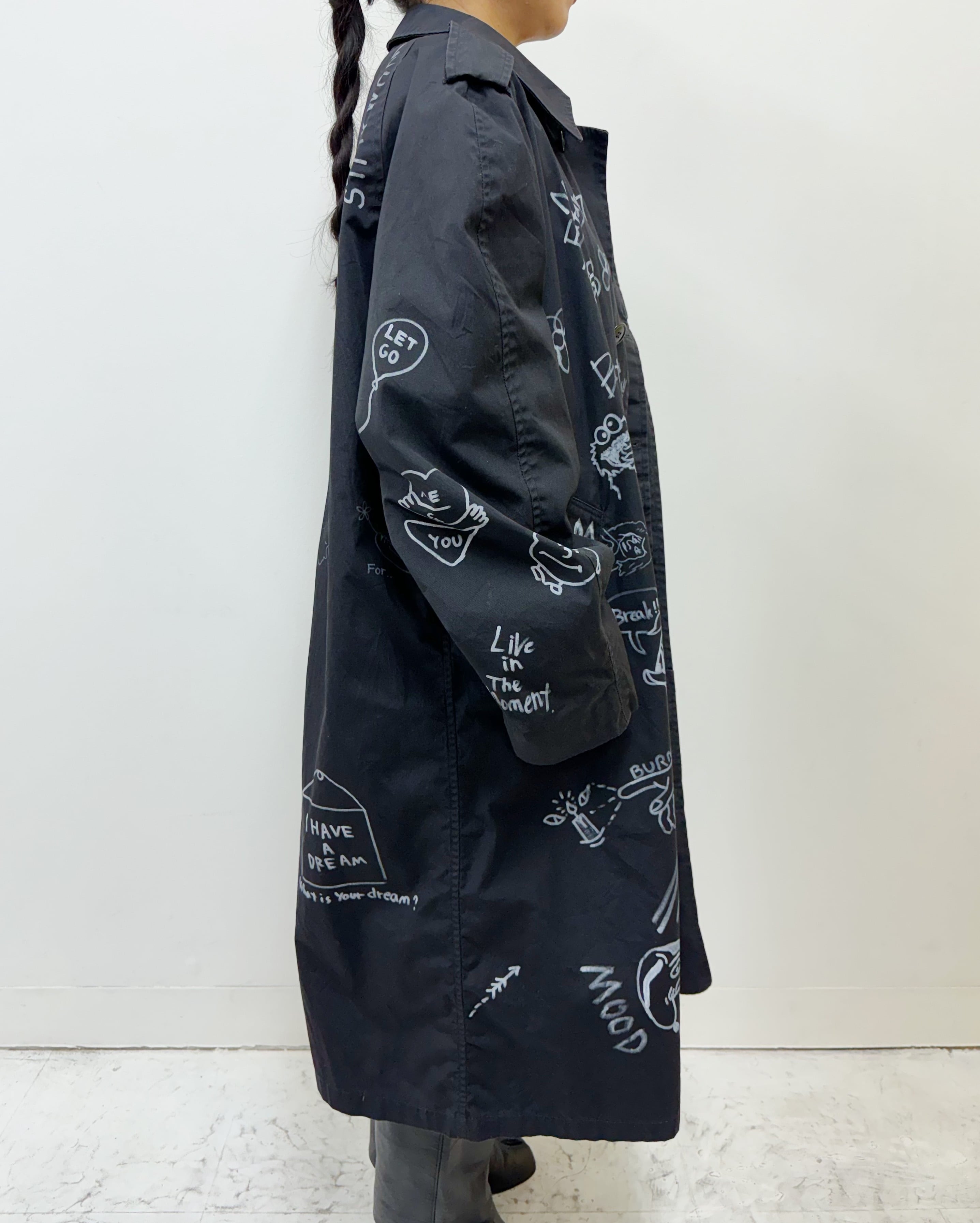 ここ日本では、ステンカラーコートの愛称で親しまれるスタンダートモデルにタマゴストアでドローイング。インクは白のみを使用し、モノトーンで大人な印象へとアップデート