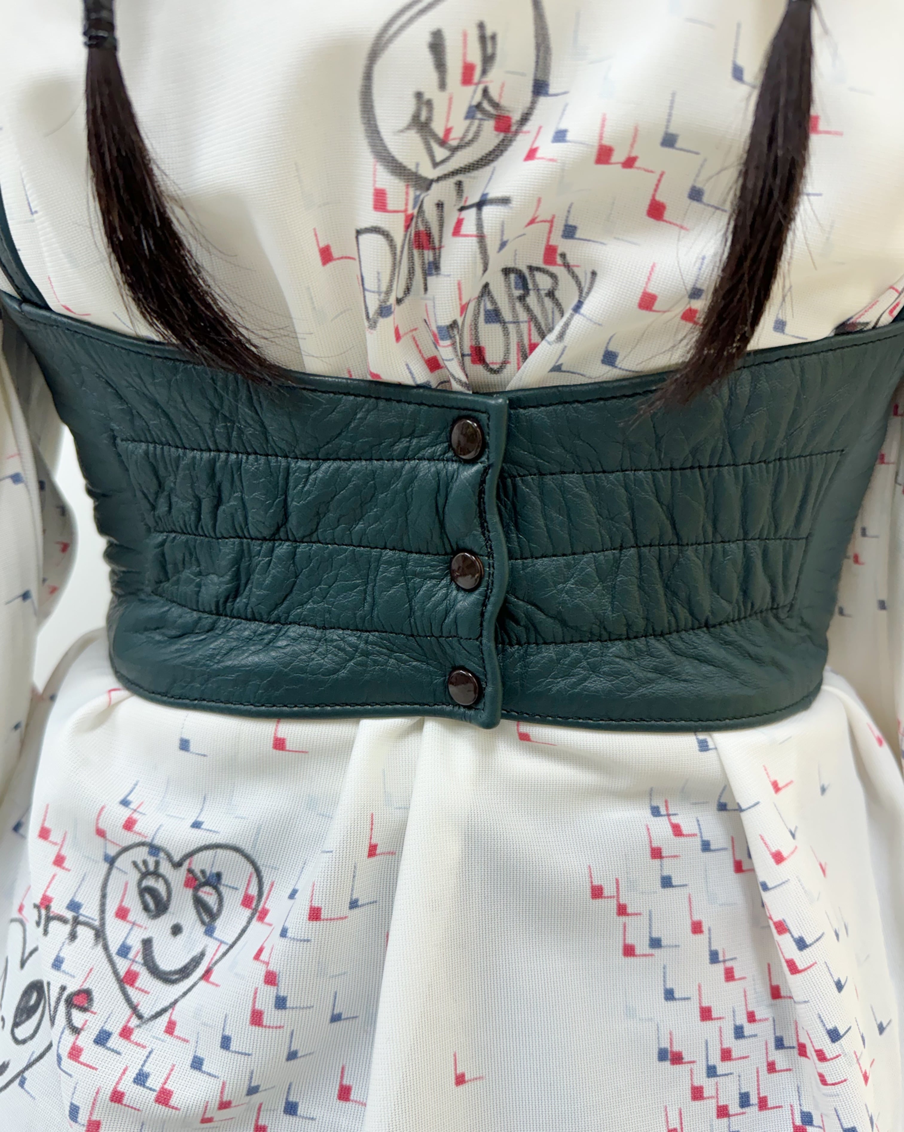 ボヘミアンスタイルの流行した70年代らしいレザー素材のビスチェ(ある意味キャミソール)